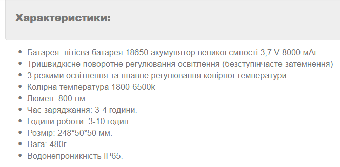 Світить дуже яскраво — освітлює всю кімнату без проблем.Тримає заряд довго, вистачає на весь вечір.І найголовніше — я тепер спокійна, бо можу ще й телефон підзарядити.
